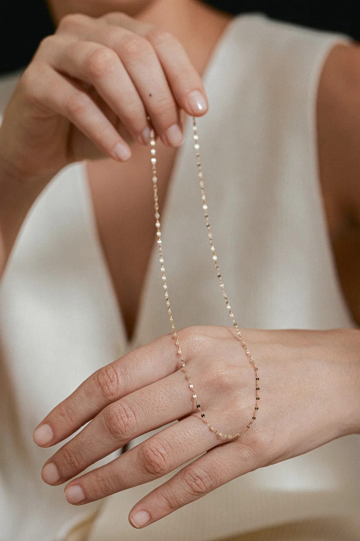 薄くプレス加工されたデザインチェーン。動きに合わせて輝きを放ち、これ1つで顔周りが明るい印象に。