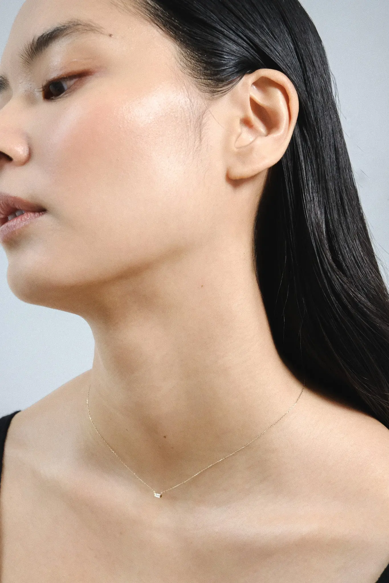 柔らかなチェーンと、ストーンのアクセントでデコルテラインを華やかに。